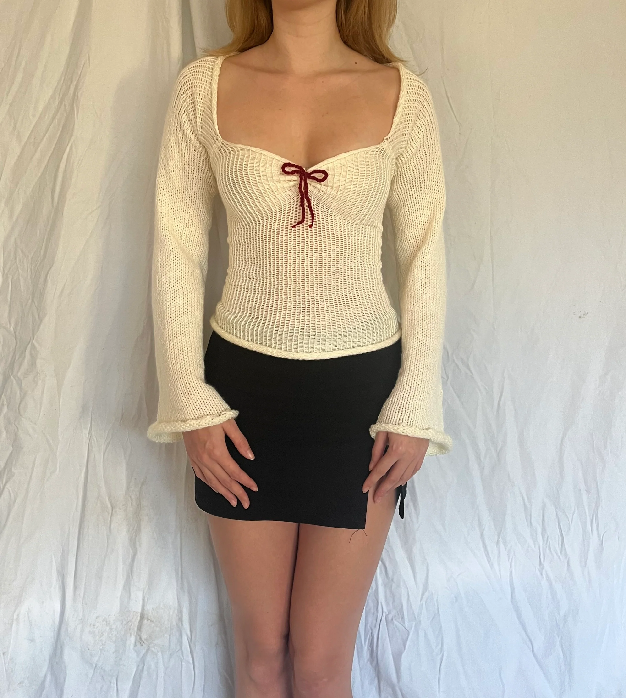 A knitted top in an off white color with a sweetheart neckline, wine red crochet bow detail open back that ties together in a cute bow